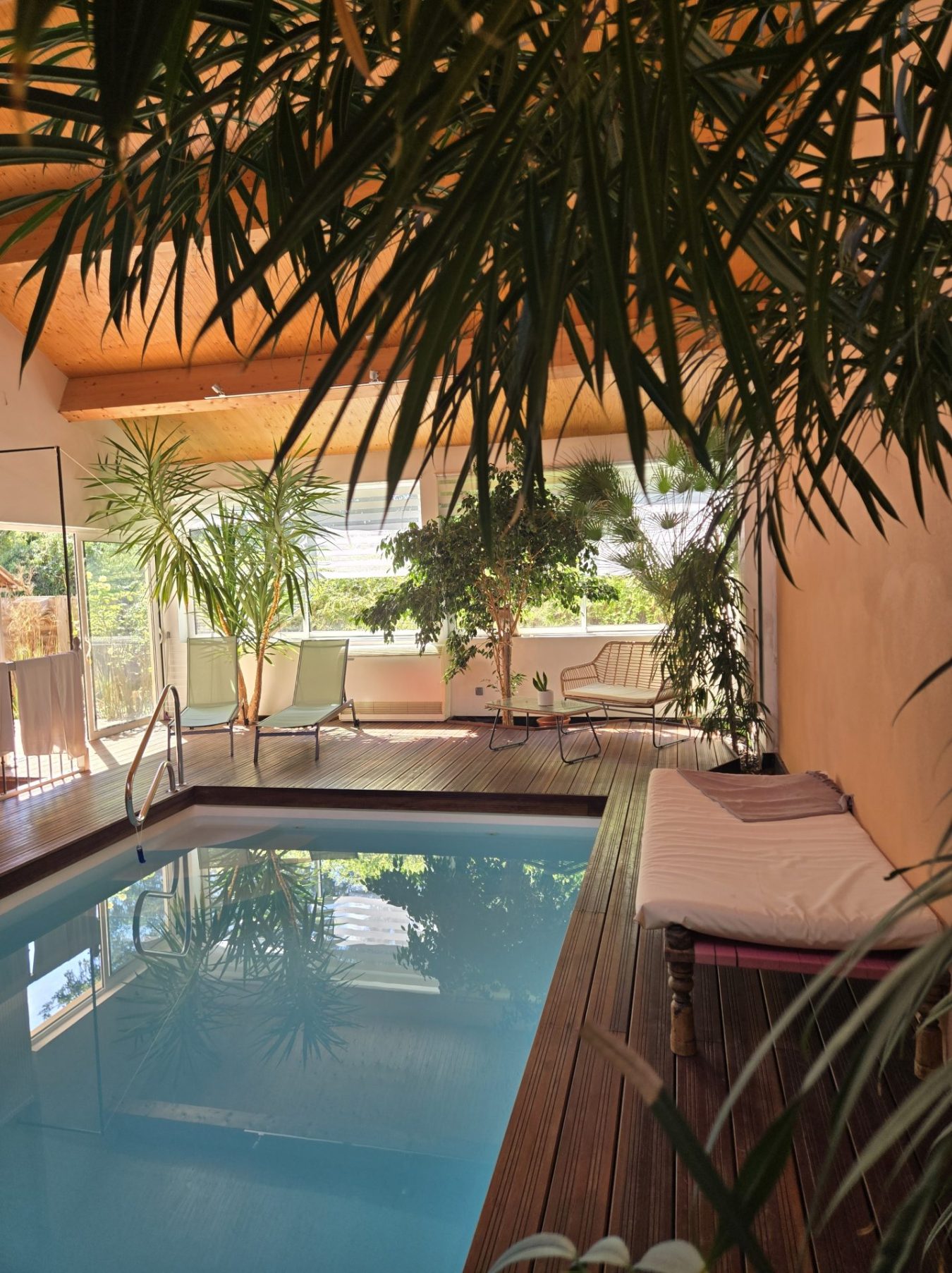 Notre piscine intérieure chauffée vous accueille dans une ambiance tropicale jusqu’au 30 novembre 2025. Elle ferme ses portes durant la période hivernale, sauf pour tout séjour de 4 nuits minimum pour les fêtes de fin d’année, entre le 20 décembre et 5 janvier 2026